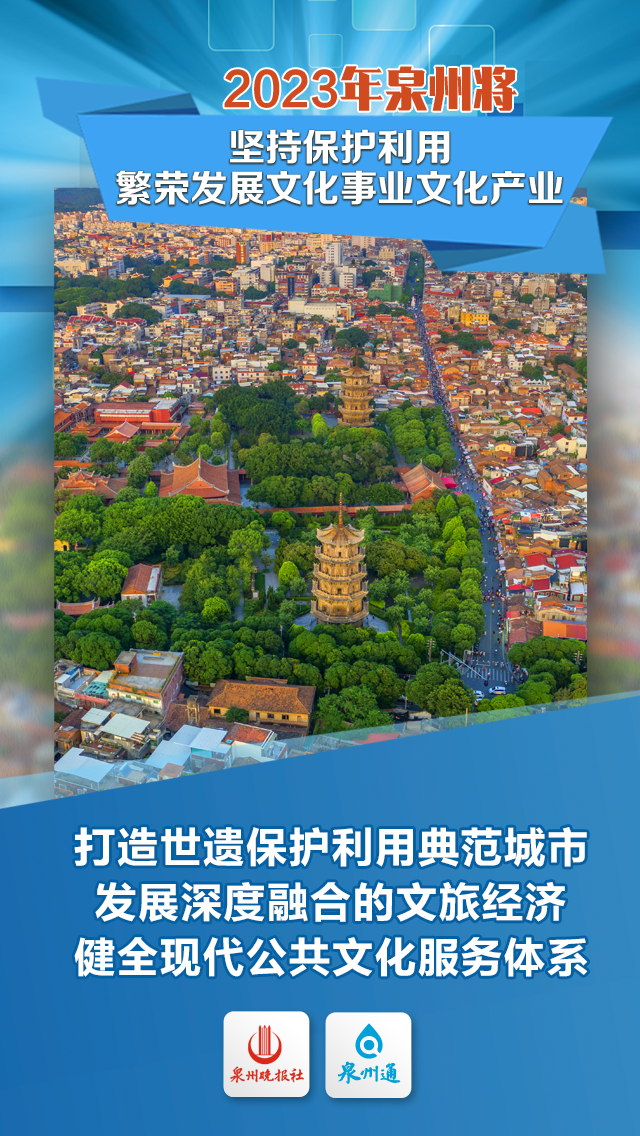 推动德化窑、永春苦寨坑窑国家考古遗址公园建设,筹办中非世界遗产能力建设泉州论坛。 加强闽南文化生态保护区管理,规划建设闽南文化产业园、博览园。 开展8个历史文化名镇名村传统村落保护提升及40处历史建筑修缮保护。 抓好“水上看泉州、夜游世遗城”等项目,推动泉州古城创建国家级旅游度假区、国家5A级景区,支持石牛山争创国家5A级景区。 组建国有演艺公司,打造海丝文旅“一台戏”,擦亮“宋元中国·海丝泉州”品牌。 建设24个新型公共文化空间,常态化开展公益演出活动1000场。