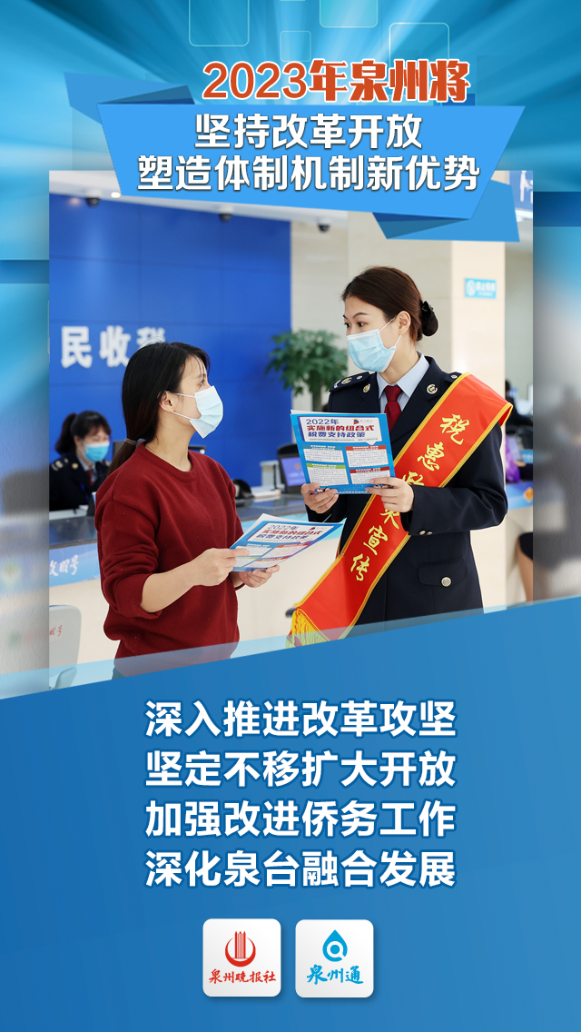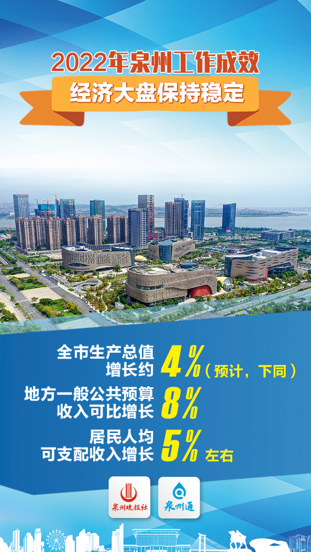 高中教育质量持续走在全省前列;持续加强就业和社会保障工作,保障农民工工资支付工作获得国务院通报表扬;德化窑、永春苦寨坑窑获国家考古遗址公园立项;加快安全生产标准化提升,完成5.2万家企事业单位标准化创建。 2023年,泉州将这样做 2023年是全面贯彻落实 党的二十大精神的开局之年 谋划好2023年的政府工作目标任务 责任重大、意义深远 2023年泉州经济社会发展主要预期目标:全市生产总值增长6.5%左右,一般公共预算总收入增长7%,固定资产投资增长8%,社会消费品零售总额增长7%,居民消费价格涨幅控制在3%左右,居民人均可支配收入和经济增长同步,完成节能减排降碳任务。 泉州将重点做好以下工作