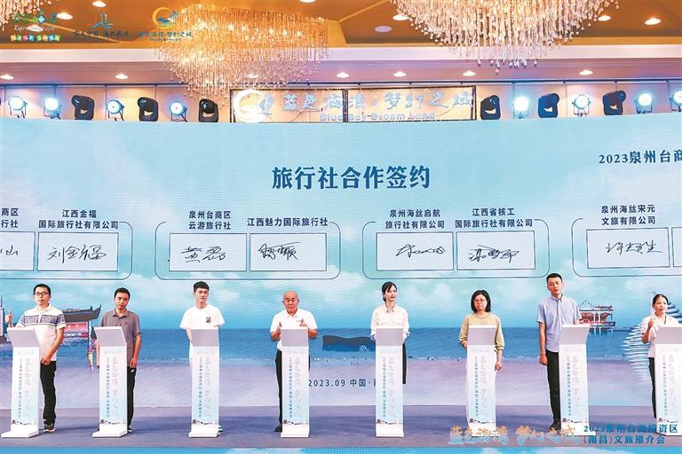 两地旅行社举行签订仪式 近日,由泉州市文化广电和旅游局指导,泉州台商投资区党工委、管委会主办,台商区教育文体旅游局承办的“蓝色海湾 梦幻之域”2023泉州台商投资区(南昌)文旅推介会在江西南昌隆重举行。泉州台商投资区相关领导及南昌市文旅局相关领导、当地旅行社、媒体记者、旅游达人等120余人参加推介会。 □本报记者 罗剑生 通讯员 朱丽琼 郑思滢 文/图 推动文旅融合 催生发展动能 当天,八仙过海旅游度假区俄罗斯大马戏舞蹈表演拉开整场活动序幕,台商区党工委委员、管委会副主任黄晓东上台致辞,盛情邀请南昌广大市民游客走进泉州台商投资区,感受文旅盛会。 会上,台商区招商投资集团推介官表示,台商区山海景色雄浑壮美,人文底色文化厚重,民俗底色风情浓郁,是文旅产业发展的厚土,是文旅项目的投资福地;台商区文旅推介团对八仙过海旅游度假区、盘扣三湾文旅、浮石隐地进行了现场推介,深入宣传台商区优美的自然环境、丰富的旅游资源以及优秀的民俗文化等内容,凸显台商区“蓝色海湾 梦幻之域”主题形象。 泉州八仙过海旅游有限公司代表与江西旅行社代表举行了战略合作签约仪式,两地文旅企业代表进行了深入交流,在扩大合作、共促文旅产业高质量发展等方面达成共识;4家旅行社通过客源输送战略合作签约实现优势互补、客源互济、资源共享、互利共赢,推动两地文旅产业高质量发展。活动过程中设置了抽奖互动环节,为参会嘉宾送上台商区旅游景区门票和旅游商品等奖品,将现场气氛推向高潮。 |