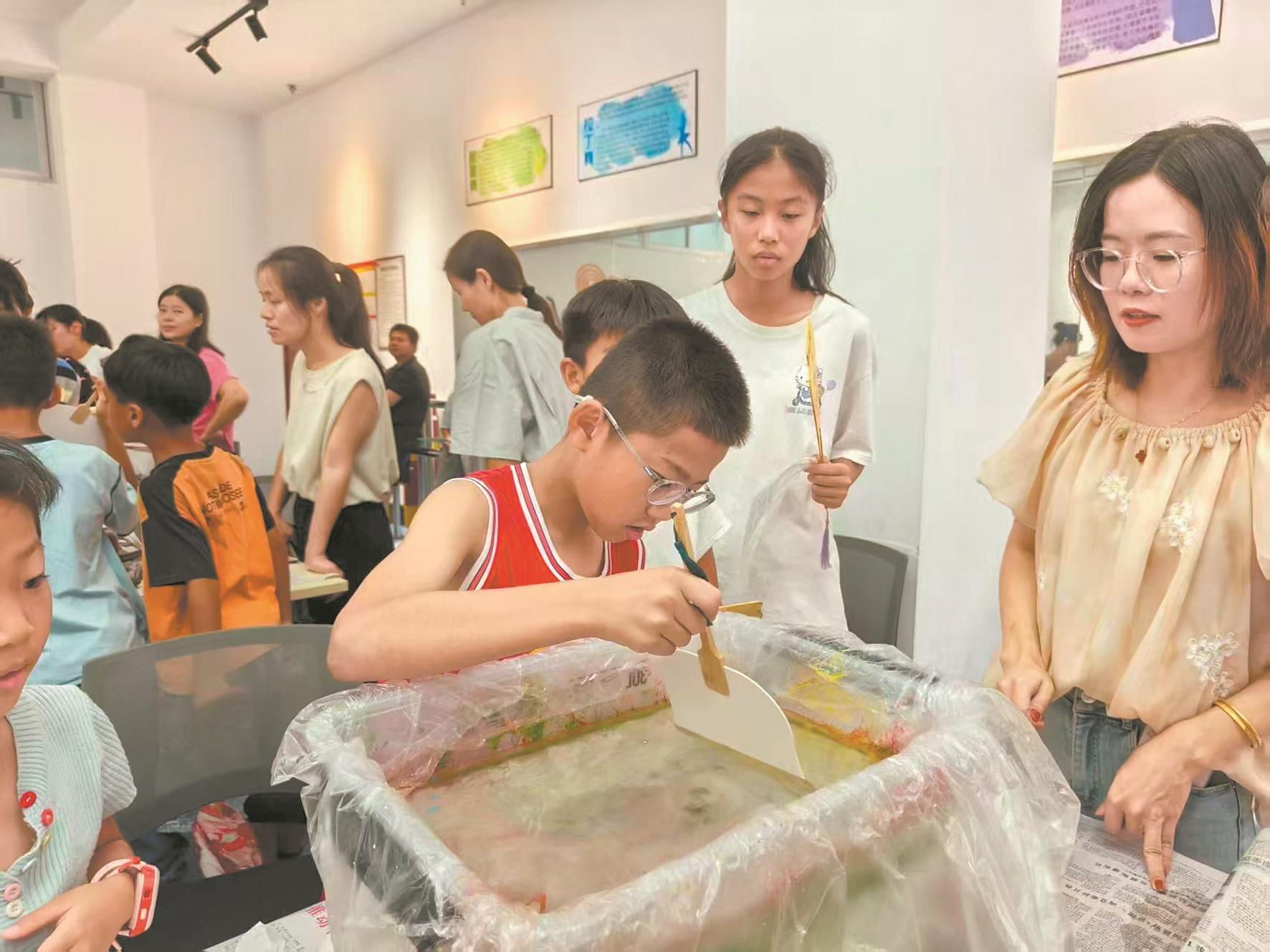 实践环节中,潘晗现场演示调漆、滴染、入水、转扇、提面等关键步骤,强调每一道工序对力道与时机的精准把控。家长与孩子携手协作,或调色,或执扇入水,小心翼翼牵引扇骨,让天然大漆在水面幻化出不可复制的纹样。