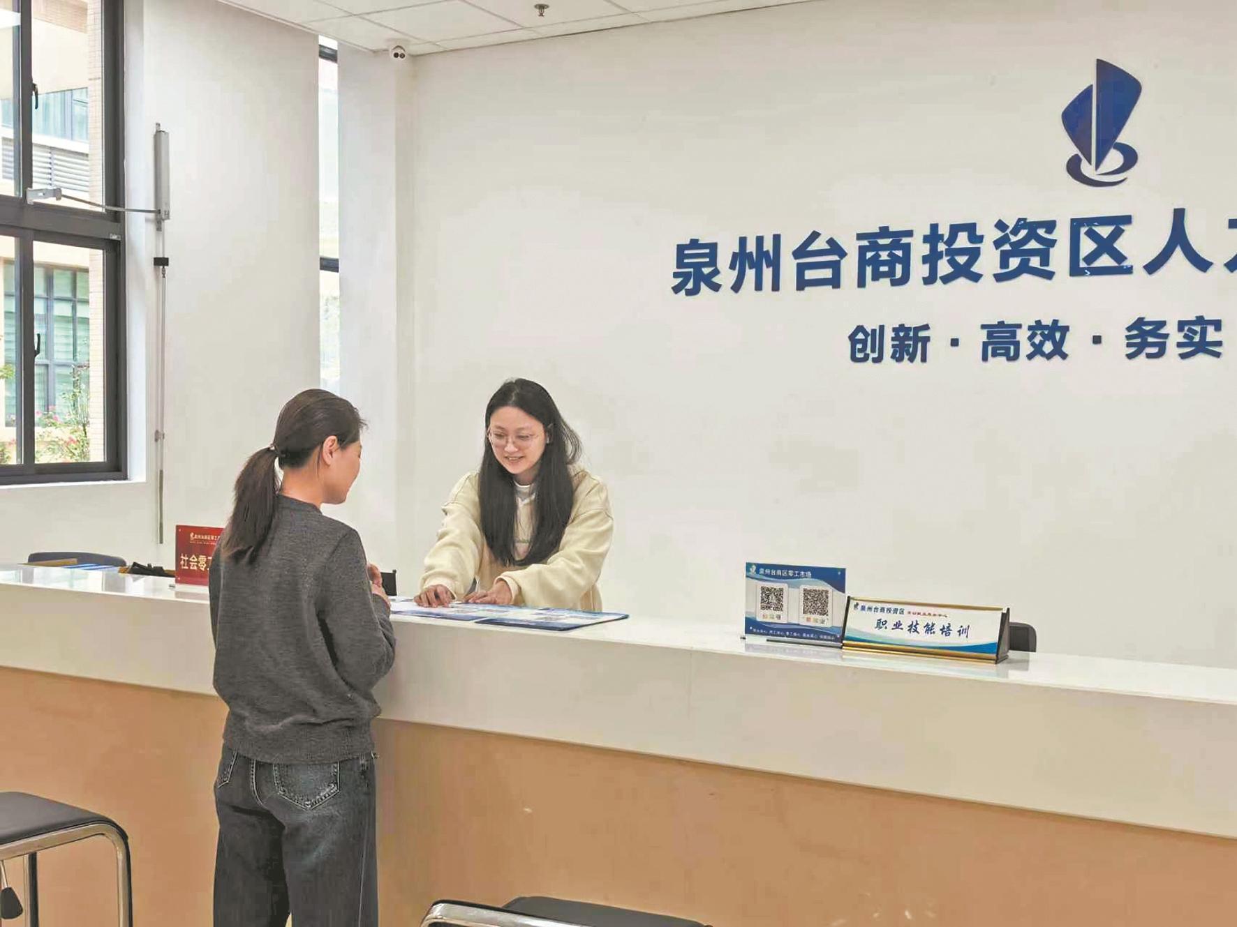 台商区零工市场服务大厅内,求职者向工作人员咨询岗位信息与职业技能培训政策。