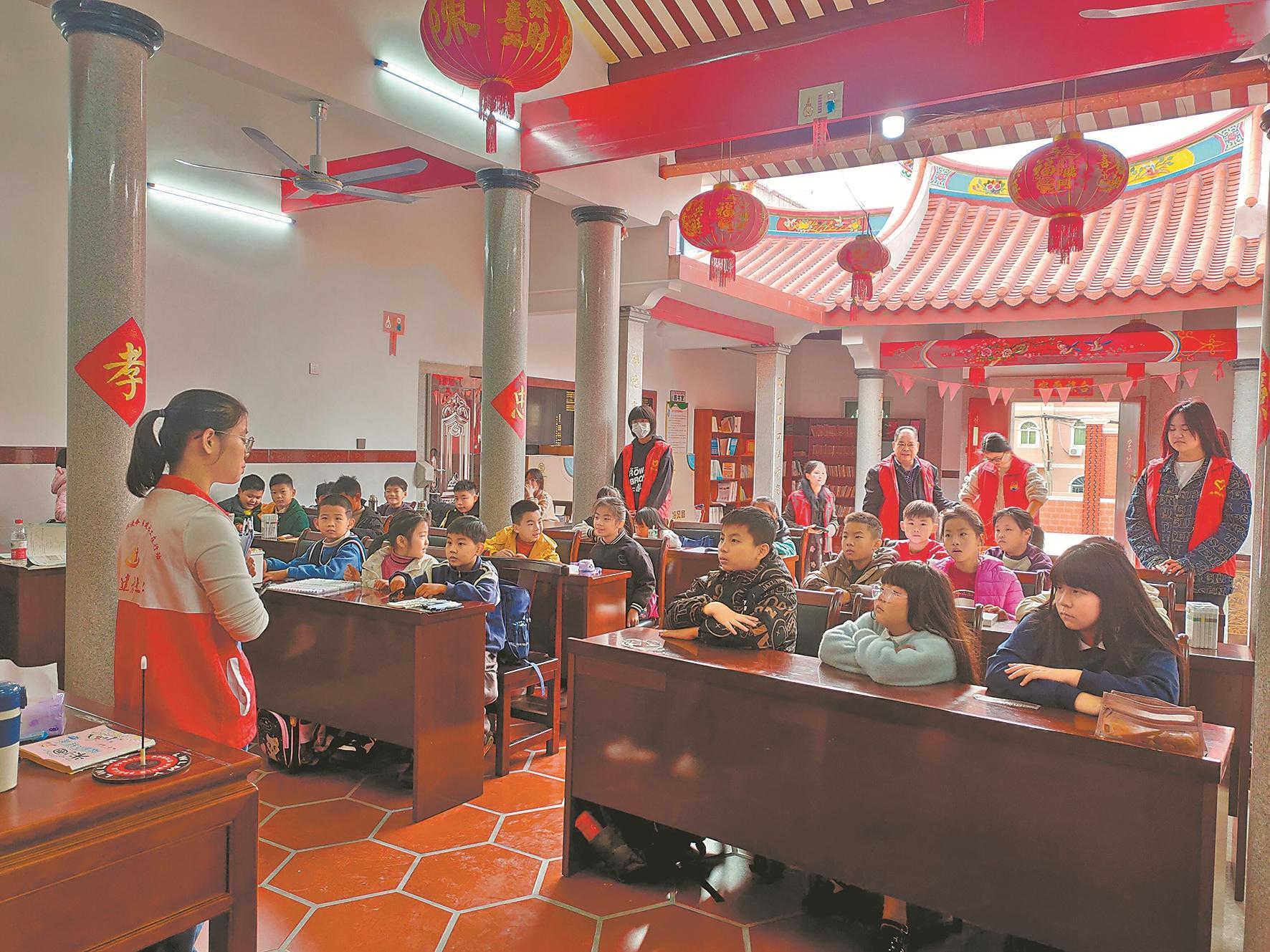 该旧宗祠曾是“陶德小学”旧址,百年来始终承载教化功能。经洛阳镇党委统筹推动、村民捐资修缮,新宗祠既保留燕尾脊、红砖墙、石雕窗等闽南风貌,又升级为集托管教学、文化展陈、议事协商于一体的党建文化综合阵地。斑驳梁柱间,新装的空调、智慧黑板与老木格窗相映成趣,历史与当下在此温柔对话。