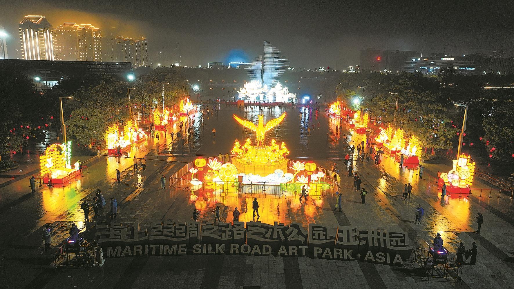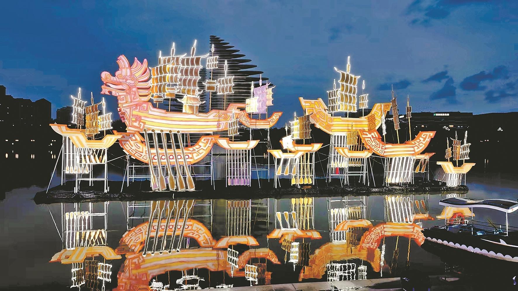 以“郑和下西洋”为主题的全市唯一水上大型主题座灯《海上千帆》夺人眼球