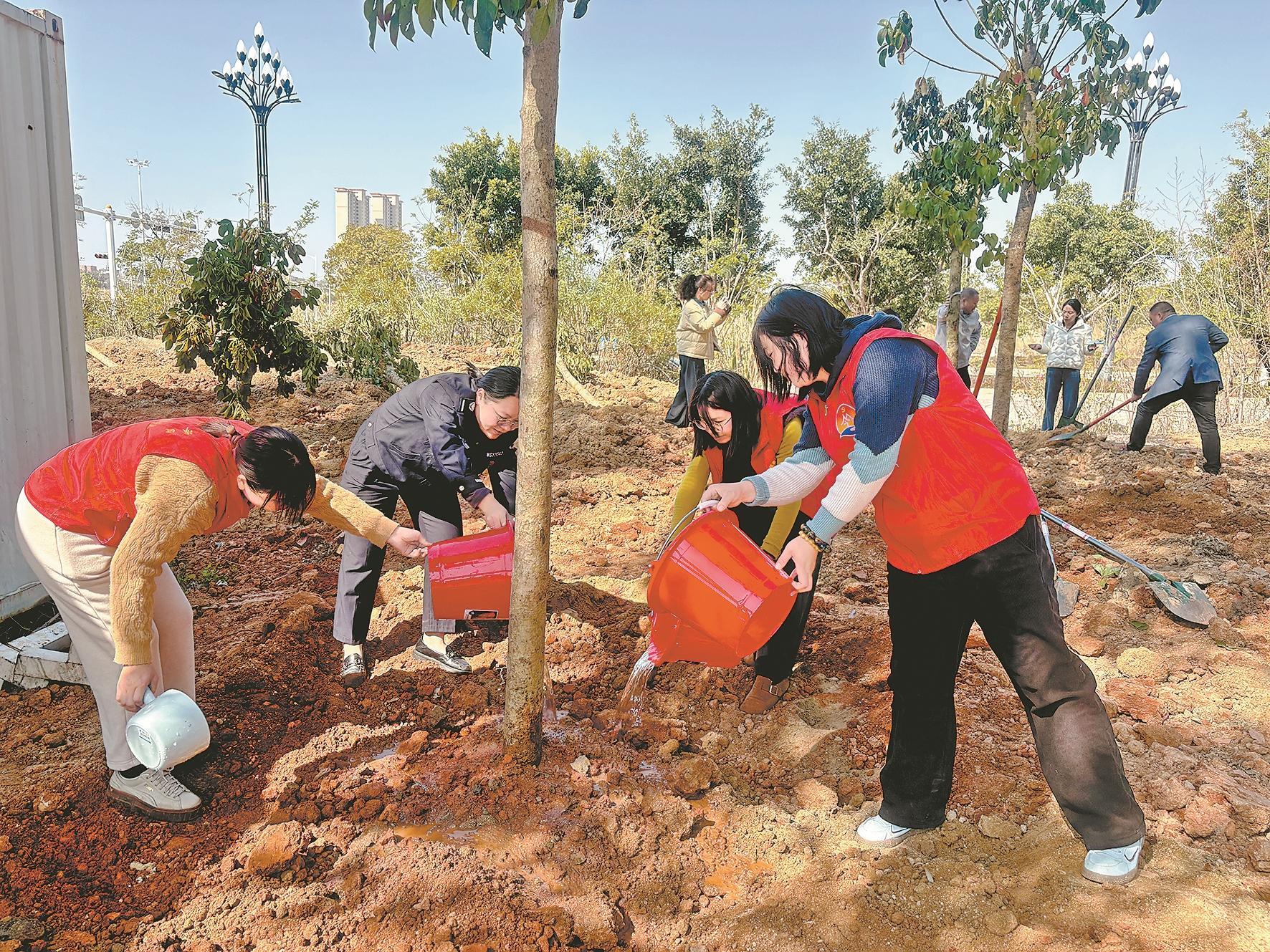 活动现场,大家分工协作、配合默契,按照苗木栽植规范,认真细致地完成每一道工序。挥锹铲土、扶苗填坑、提水浇灌……各个环节有条不紊,确保栽一棵活一棵、植一片绿一方。党员志愿者们以身作则,把生态理念融入劳动实践,在植树造林中践行初心使命,传递绿色发展正能量。
