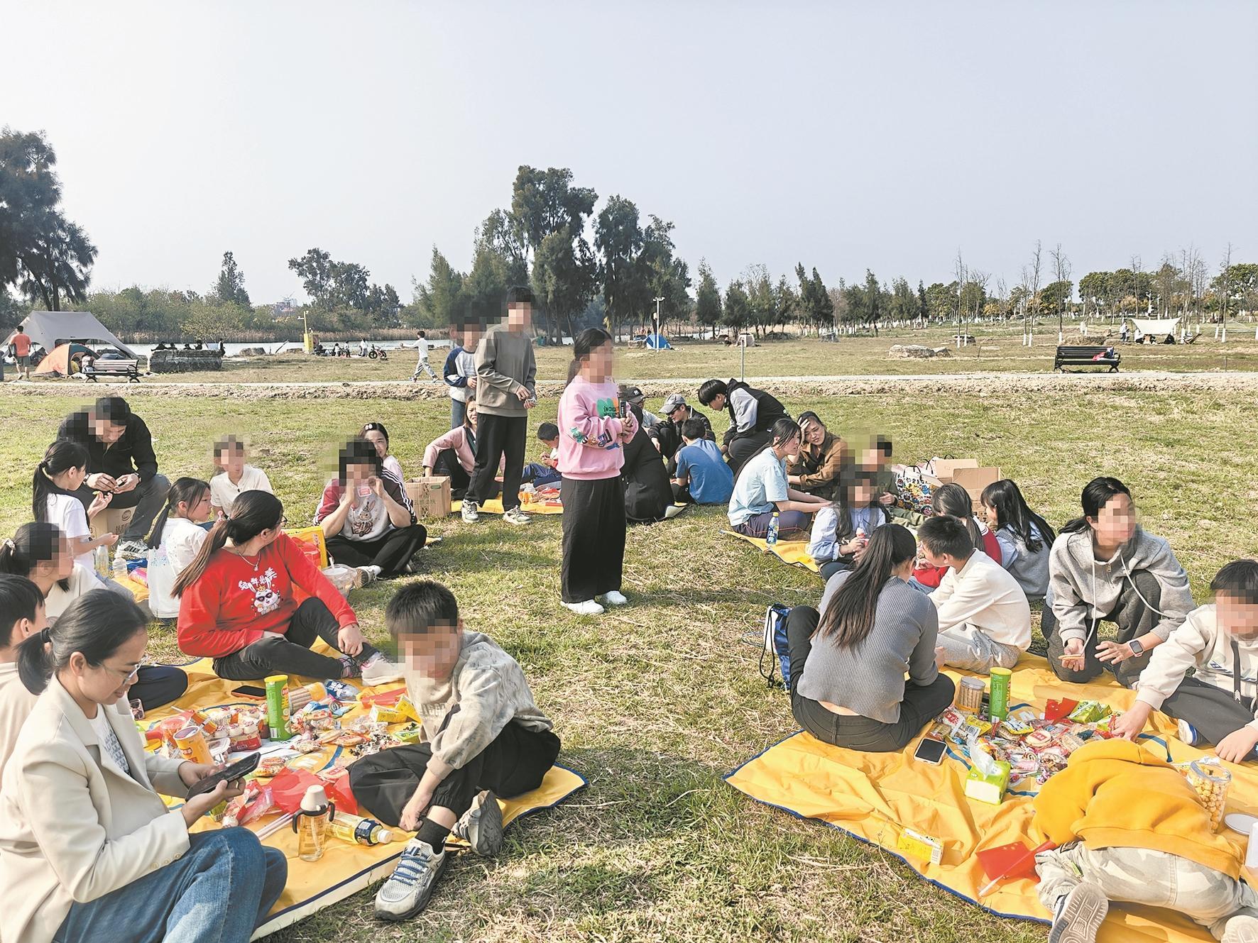 随后的春日踏青会中,孩子们完成2公里徒步研学,沿途学习植物科普知识与泉州海丝文化,在一步一行间,把自然生机与城市文化悄悄收进成长行囊。踏青研学环节结束后,社工在公园临江开阔草坪精心设置春日露营休憩区,儿童和家长们围坐在一起,一边欣赏江畔风景,一边展示才艺和互动,沉浸式拥抱春日的烂漫与松弛。