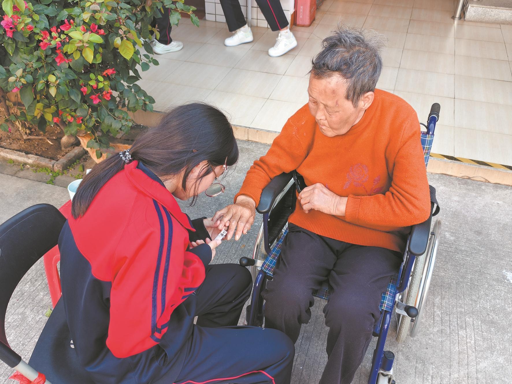 学生志愿者为老年人剪指甲