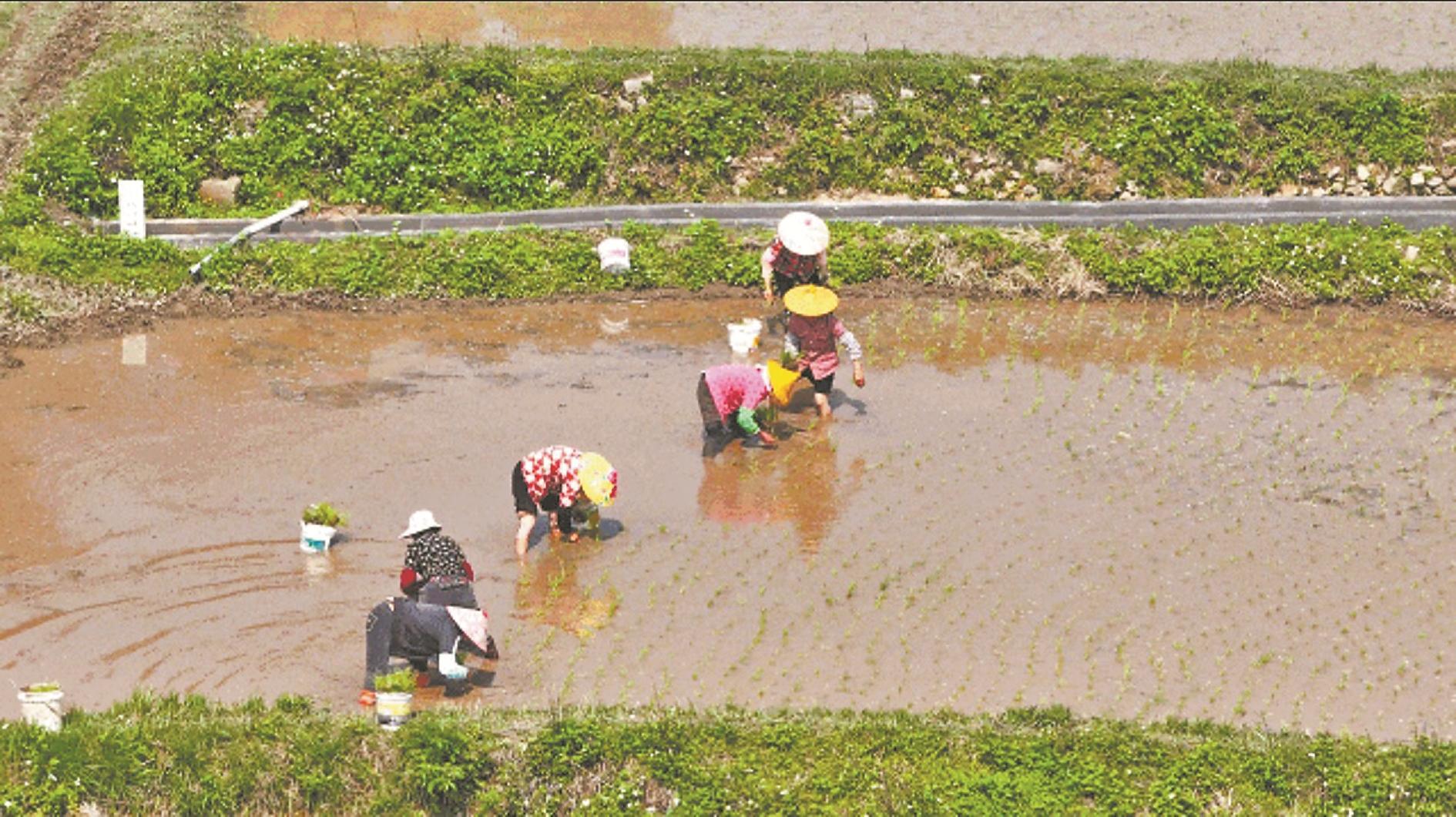 农户正在抢插早稻秧苗,农田一片繁忙景象。